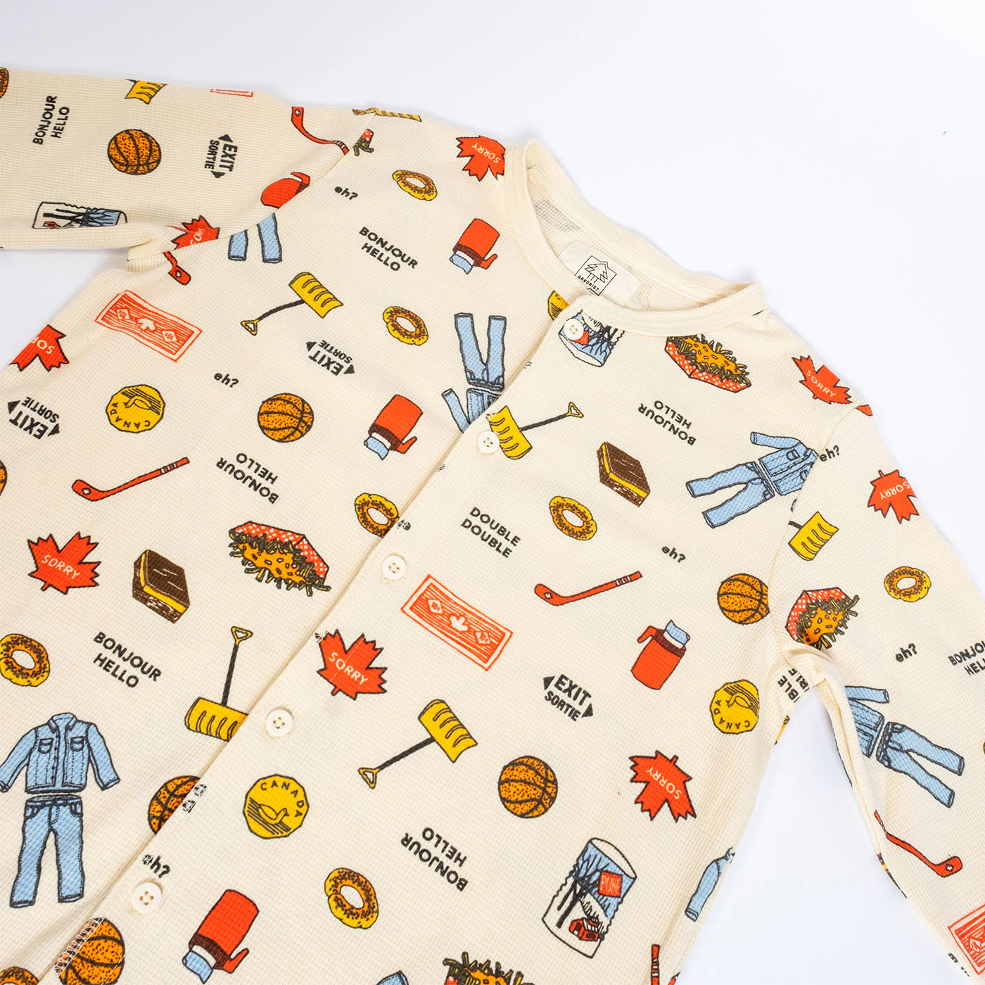 From loonies to bagged milk, the Eh! Canada onesie features an all over print with all the things that make our home and native land so special. Perfect for lovers of all things Canadian, the Eh! Canada Onesie is way more fun to put on than sweats, and cozier than regular ol’ pyjamas. Whether you're lounging around the house, cottaging with friends, or bundling up for bed, this waffle-knit onesie will keep you toasty all season long.